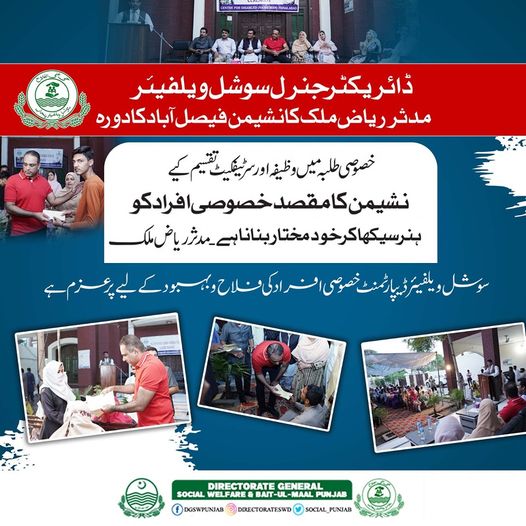 Director General Social Welfare Muddassir Riaz Malik visited Skill Training Center for Persons with Disabilities, Nasheman, Faisalabad. He distributed scholarships and certificates among special students.