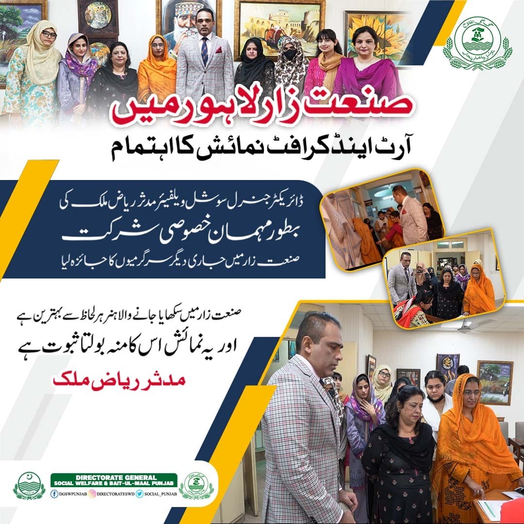 May 03, 2023 An art and craft exhibition was held at Sanatzar Lahore. Director General Social Welfare Muddassir Riaz Malik was thee chief gust of the event.