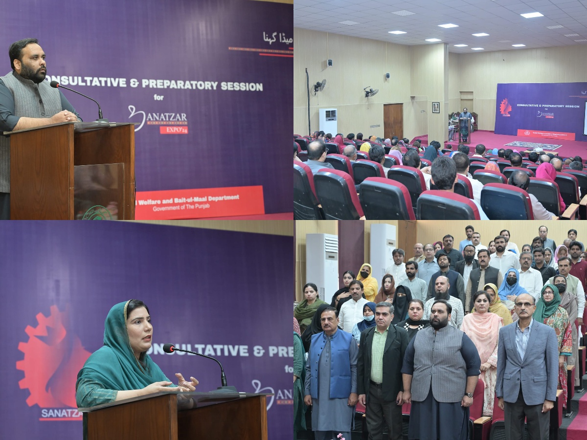 A Consultative and Preparatory Session for the upcoming "Sanatzar Expo24" was held at the Social Welfare Training Institute auditorium in Lahore. Director General of Social Welfare & Bait-ul-Maal Punjab, Sikandar Zishan, emphasized Sanatzars as the department’s signature initiatives, encouraging improvement through individual and collaborative efforts, like the forthcoming WEXNET Exhibition 2024. Director Program Zaib Waseem gave an analytical presentation on Sanatzars' objectives and proposed enhancements, while members of the Think Tank offered motivational and insightful guidance to support the institutions’ progress.