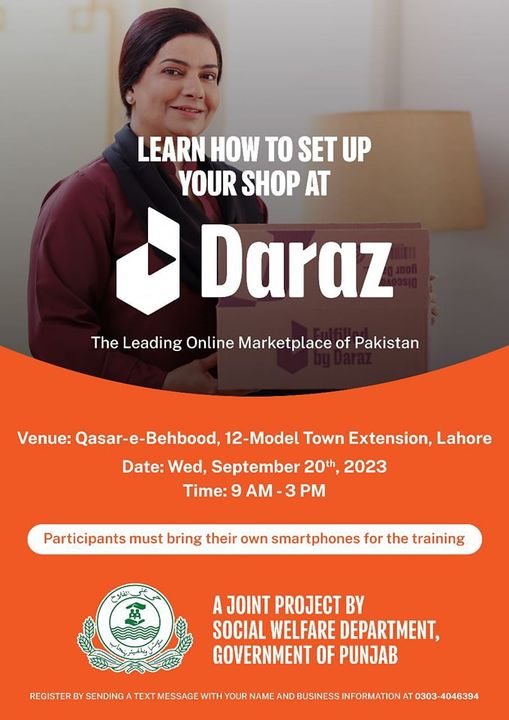 Great opportunity for women entrepreneurs at Sanatzars to use DARAZ as their gateway platform for setting up digital shops. Free of cost exclusive training by DARAZ at Sanatzars and Qasr e Behbood.