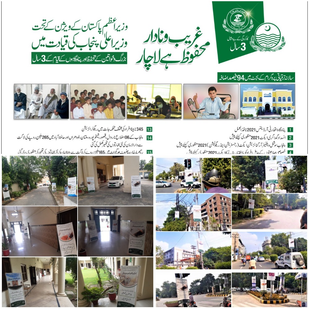 • Streamers have been displayed on the roads (Egerton road,Davis road,Club chowk,Alhamra chowk,and Governor house chowk) containing information of initiatives taken for welfare of destitute, neglected and disabled people of the society.