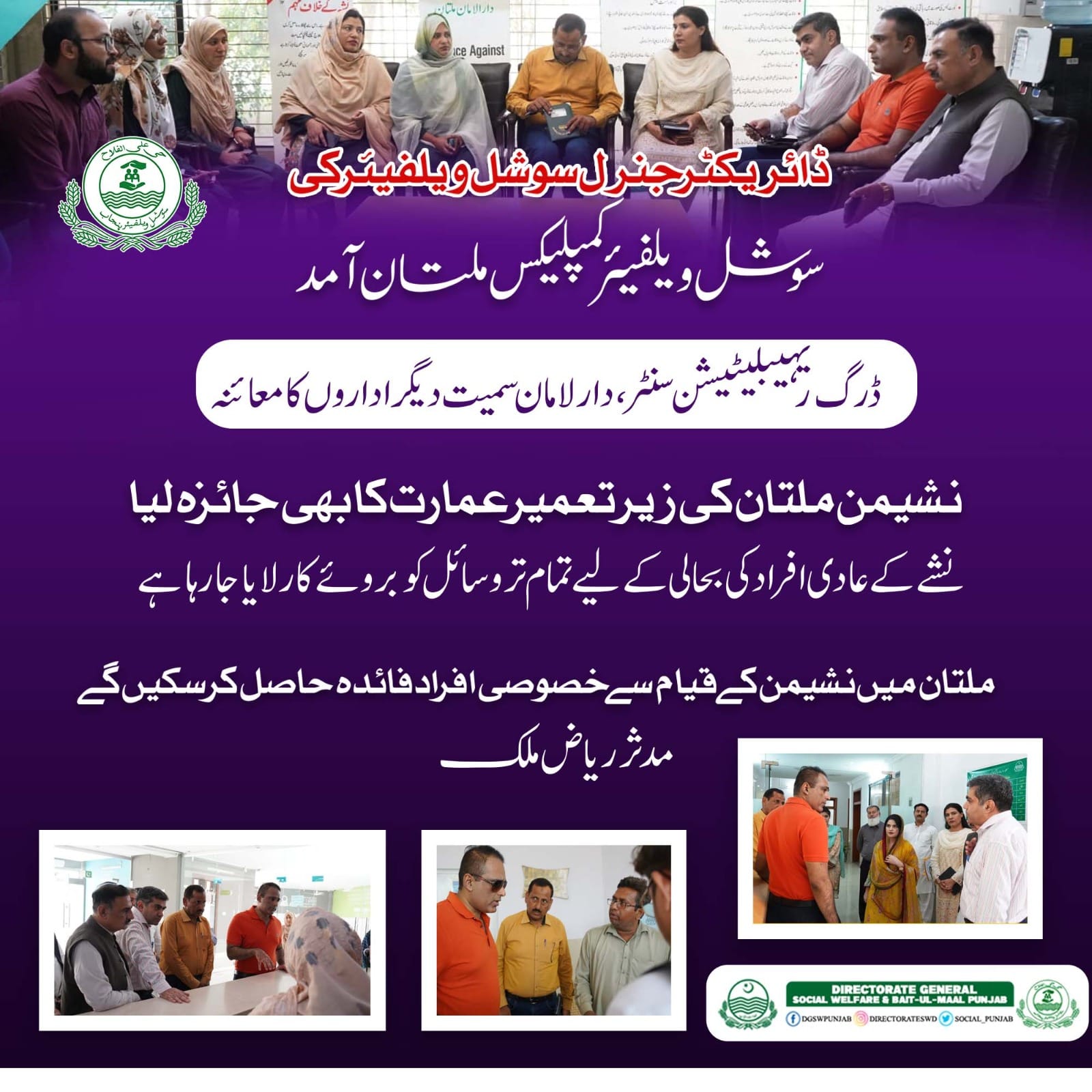 Director General Social Welfare Muddassir Riaz Malik visited Multan. During his visit he monitored various institutes ,such as Sanatzar, Drug rehabilitation center ,Dar ul Aman, VAWC ,old Age home Multan. He also visited Pannahgah building at Nishter Hospital Multan.