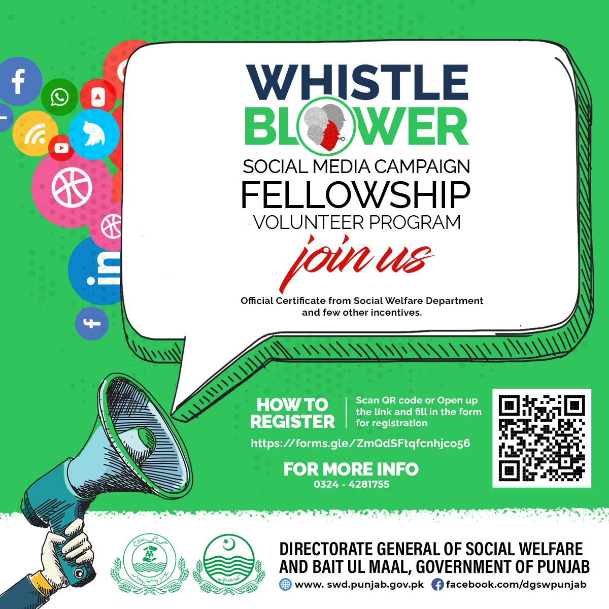 Register yourself for Whistle Blower Social Media Campaign Fellowship Volunteer Program an initiative of Directorate General of Social Welfare & Bait-ul-Maal Punjab