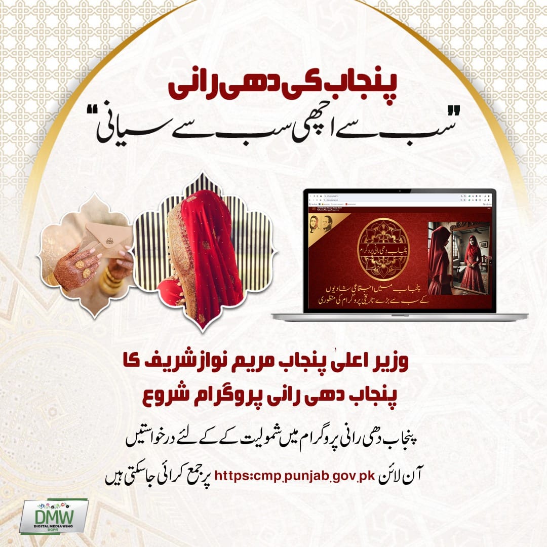 Nov 15, 2024 Chief Minister Punjab Maryam Nawaz Sharif launches the Punjab Dhee Rani Program! Apply online now at cmp.punjab.gov.pk to join. For assistance, call the dedicated helpline at 1312.