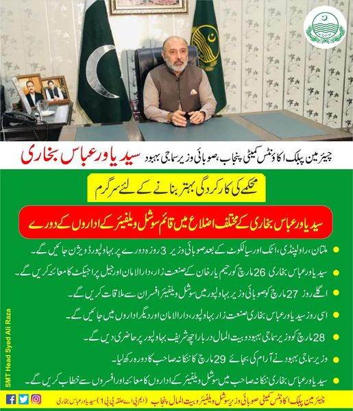 چیئرمین پبلک اکاؤنٹس کمیٹی پنجاب، صوبائی وزیر سوشل ویلفیئر و بیت المال پنجاب سید یاور عباس بخاری محکمہ سوشل ویلفیئر کی کارکردگی بہتر بنانے کیلئے سرگرم