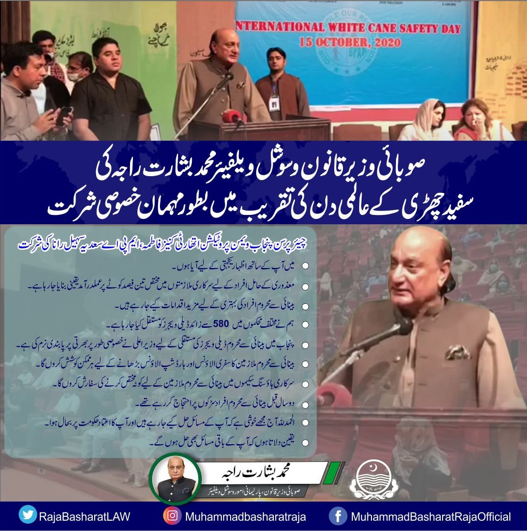 Oct 15, 2020 Mr. Basharat Raja, Minister Social Welfare & Bait-ul-Maal Department while addressing on the eve of International White Cane Safety Day 15-10-2020